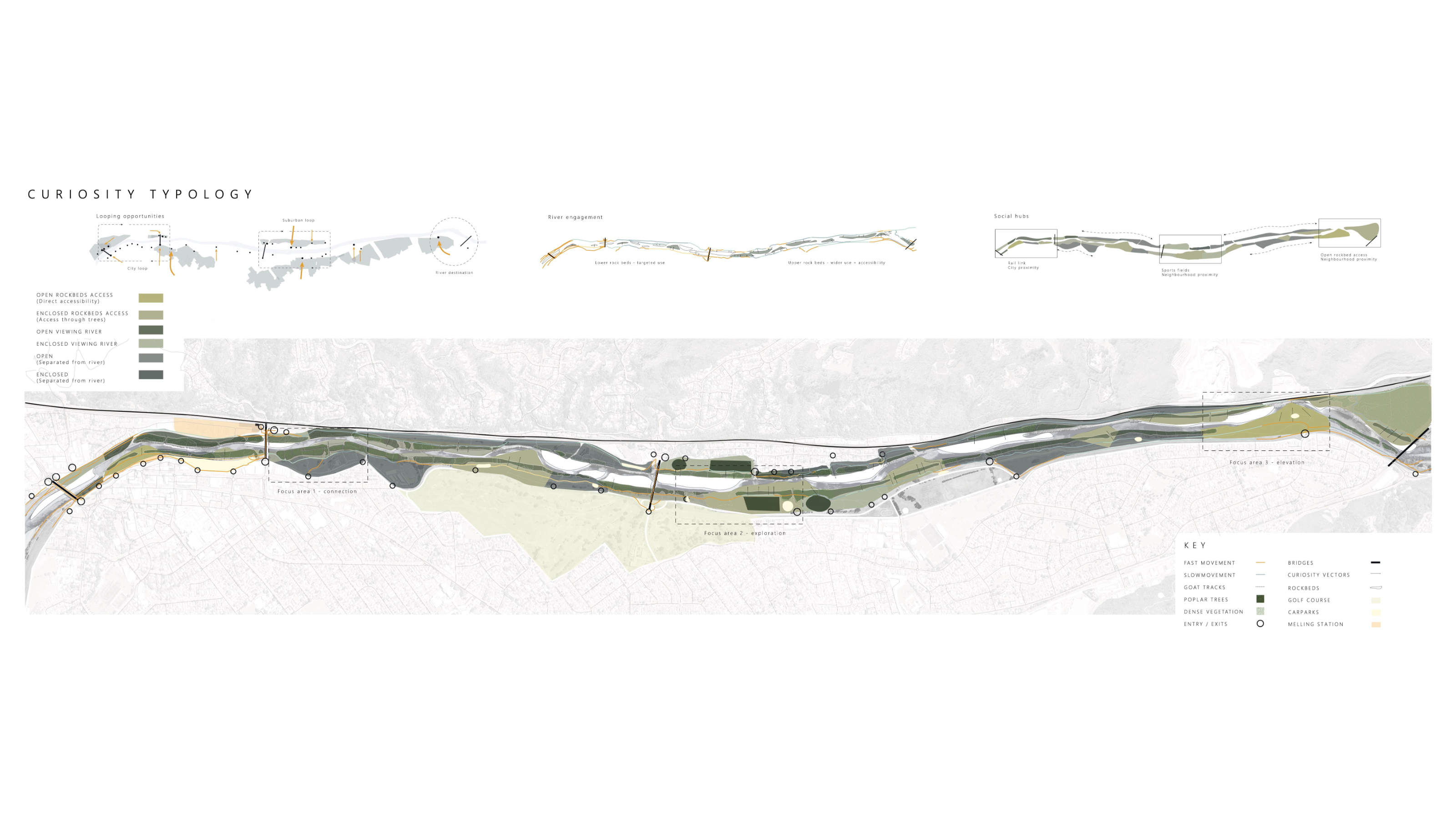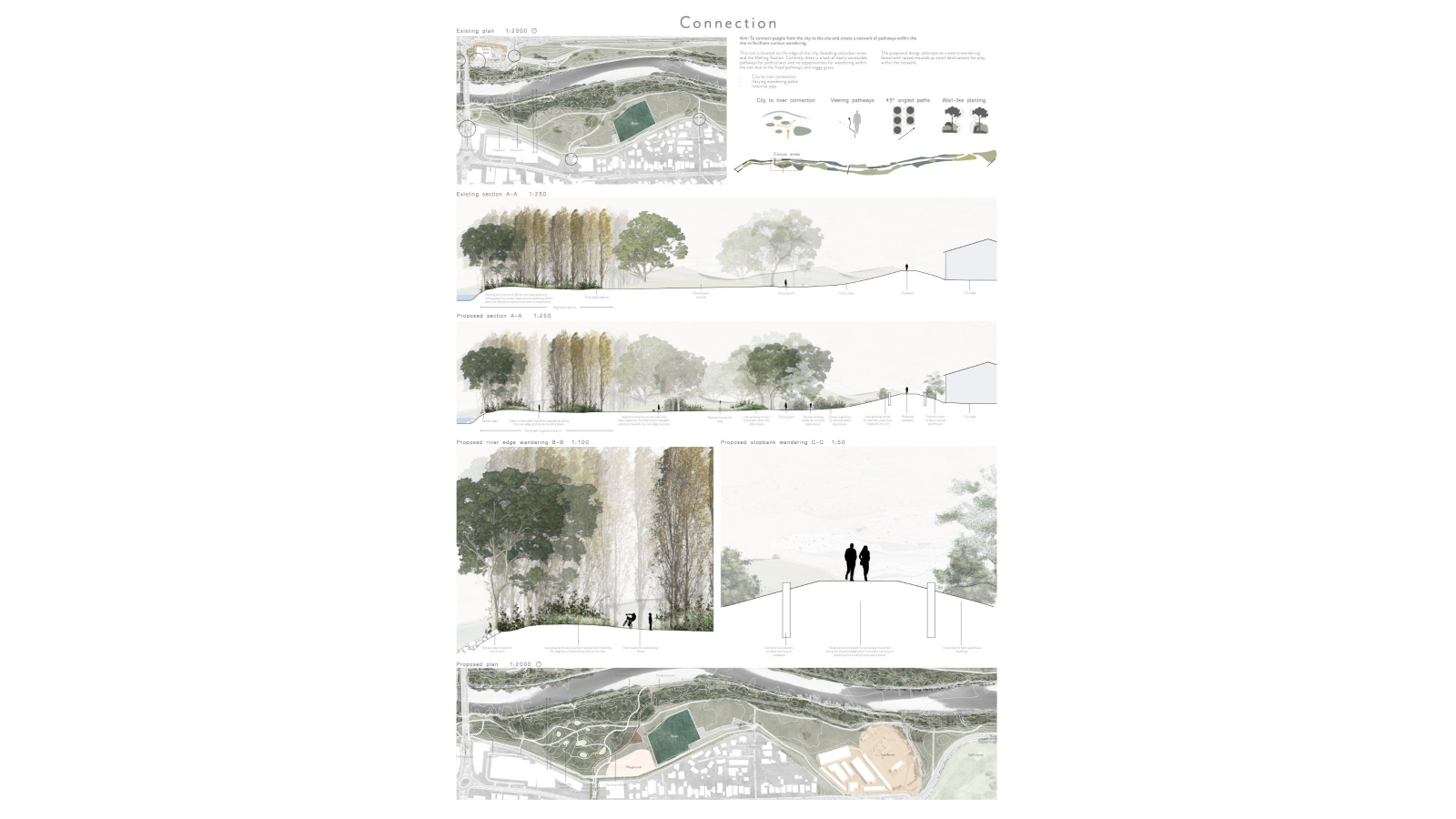 This acquired knowledge informed the design approach where I selected areas that provided the opportunity to connect surrounding neighbourhoods to the river and stimulate their sense of curiosity within the site to encourage greater use of these spaces.